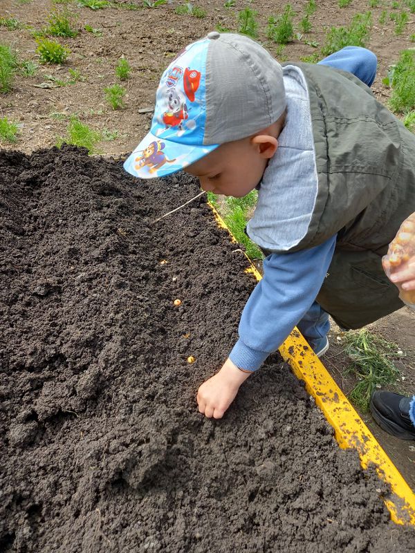 упражнять детей в правильной посадке луковицы (посадить вниз донцем в лунку, пальцами плотно прижать землю);