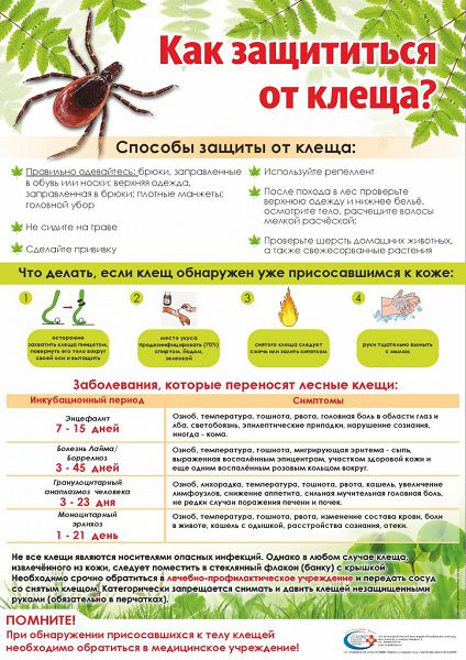 Основная мера защиты – не допускать присасывания клещей. Для этого используют средства индивидуальной защиты: рациональное использование обычной одежды и отпугивающие средства (репелленты). При посещении леса одевайтесь так, чтобы исключить возможность заползания клещей под одежду и на открытые участки кожи, за воротник, на волосы. Через каждые 1,5-2 часа пребывания в лесу проводить само - и взаимо осмотры верхней одежды и открытых частей тела.