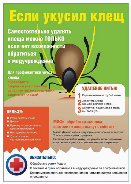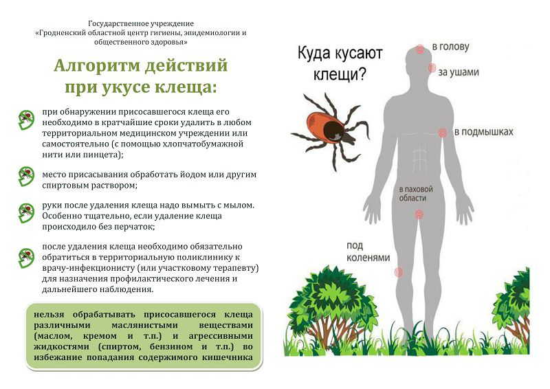 Клещей, снятых с тела, необходимо поместить в пузырек (в крайнем случае сжечь или залить кипятком). Не следует давить их пальцами, т.к. если клещ заражен, то вирус может попасть в организм человека через слизистые носа, глаз и незначительно поврежденную кожу.