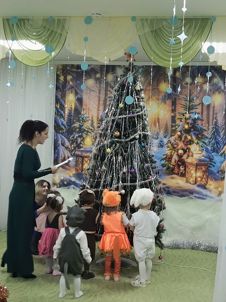 Малыши в красивых нарядах пришли в музыкальный зал, где горели тысячи новогодних огней, и закружились в новогоднем хороводе. В гости к ним пришли Снегурочка, Дед Мороз и Зайка. Дети вместе с героями веселились у нарядной ёлочки: танцевали с погремушками, с любимыми игрушками. Наши малыши были такие нарядные и удивительные!