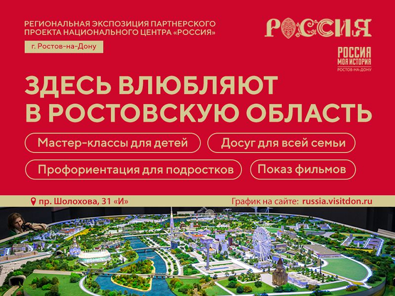 На базе «Центра исторического парка «Россия – моя история» (г. Ростов-на-Дону, пр. Шолохова, 31И) работает региональная экспозиция партнерского проекта Национального центра «Россия», на которой обеспечена постоянная работа отраслевых площадок экспозиции, представляющих экономический, научно-образовательный и туристский потенциал муниципальных образований региона, а также организованы интерактивные мероприятия и мастер-классы.